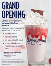 Come celebrate our grand opening with us! MilkShake Factory Palma Sola is so excited to be part of the Bradenton community. We are hosting a grand opening event on Saturday, January 24th from 12-4pm. We will have buy one get one FREE on all milkshakes, free t-shirts for the first 100 guests, chocolate sampling, a first guest in line gift basket, a DJ, and more!