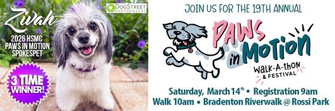 Bradenton, FL — The Humane Society of Manatee County (HSMC) will host the 19th annual Paws in Motion Walk-a-thon on Saturday, March 14, 2026, bringing together families, dogs, and animal lovers for a morning of fun and fundraising.