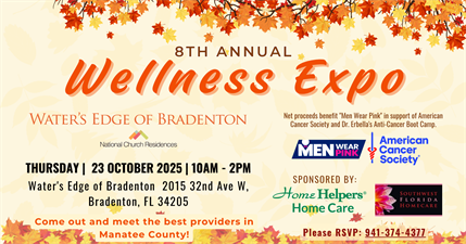 Join us for the 8th Annual Wellness Expo at Water’s Edge of Bradenton on Thursday, October 23, 2025, from 10 AM to 2 PM at 2015 32nd Ave W, Bradenton, FL!