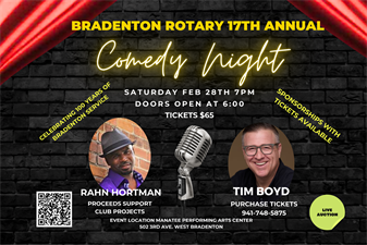 Please come and enjoy an evening of laughter. The Rotary Club of Bradenton is hosting their 17th annual Comedy night. Performers are Rahn Hortman and Local Comedian Tim Boyd. Both are very funny while keeping the show clean. Proceeds go to fund local Bradenton Rotary projects. The location is the Manatee Performing Arts center and ticks can be purchased by calling the box office at 941--748- 5875. Doors open at 6PM and show starts at 7. Cash bar and deserts included.
