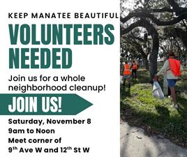 Join Mayor Brown and Keep Manatee Beautiful for a Downtown Bradenton Cleanup! We’ll come together to pick up litter, beautify our streets, and show pride in keeping Manatee County clean, green, and welcoming for all. Volunteers will meet at the corner of 9th Ave W and 12th St W at 9:00 a.m. All supplies, gloves, and bags will be provided—just bring your energy, sunscreen, and community spirit. Please wear closed-toe shoes and comfortable clothes, and remember to stay hydrated. Let’s make a visible difference together with Mayor Brown and Keep Manatee Beautiful!