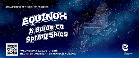 Join us in the Planetarium at The Bishop to celebrate the Vernal Equinox with a one-hour live presentation, getting to know your night sky! Explore the stories amongst the stars, learn some tips and tricks to navigating the night sky, and take a closer look at deep sky objects through the James Webb Space Telescope (JWST)!