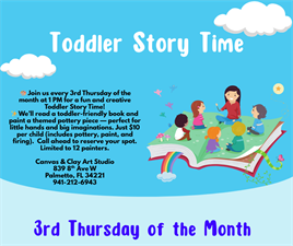 ? We’ll read a toddler-friendly book and paint a themed pottery piece — perfect for little hands and big imaginations. Just $10 per child (includes pottery, paint, and firing).